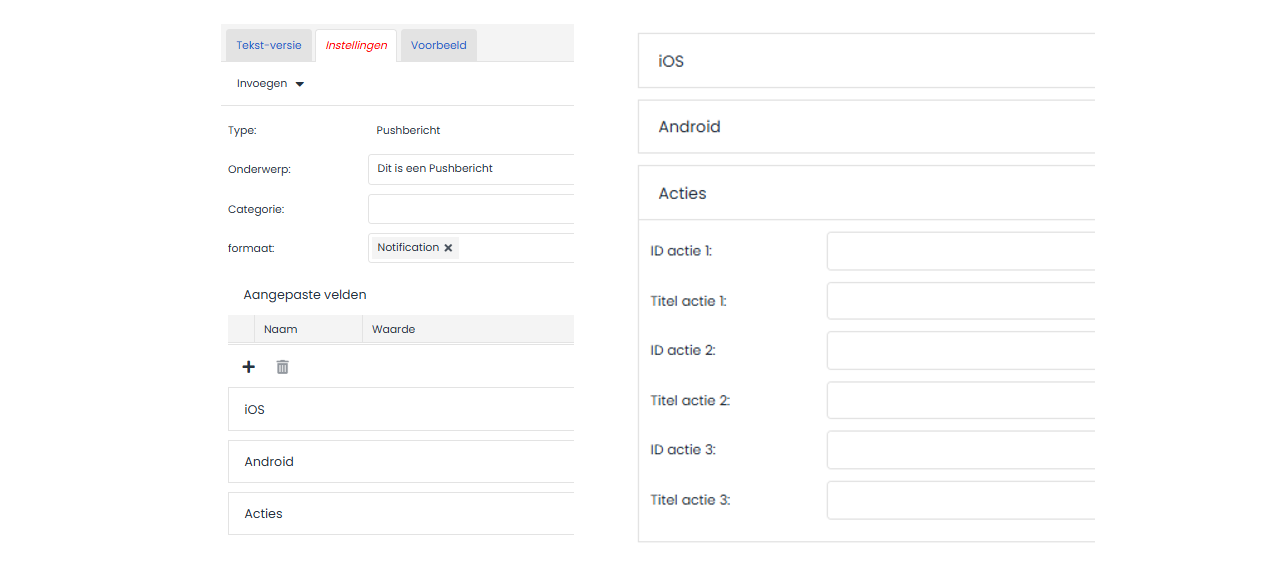 - De instellingen-tab voor Push Notifications heeft een nieuwe vormgeving gekregen om meer overzicht te bieden, met nieuwe inklapbare secties voor de verschillende instellingencategorieën: iOS, Android en Acties. Deze secties zijn standaard ingeklapt, terwijl de algemene instellingen altijd bovenaan de pagina worden weergegeven.