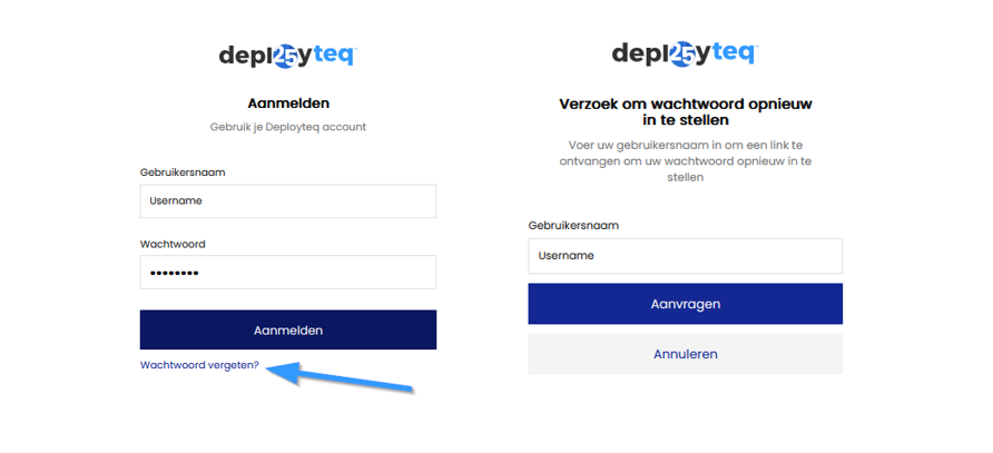 - Is je iets opgevallen bij het inloggen? Eén van de meest-gestemde verzoeken uit de Deployteq Community is er: je kunt nu zelf je wachtwoord resetten! Voorheen kon dit alleen door een portal admin of iemand met voldoende adminrechten worden gedaan. Klik op de link ‘Wachtwoord vergeten’ op het inlogscherm, vul je gebruikersnaam in en je ontvangt een e-mail met een resetlink die 15 minuten geldig is.